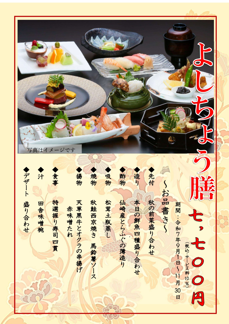 秋のよしちょう膳 2025.08.19 フェア・特集 フェア・特集:吉長 期間 令和7年9月1日~11月30日 料金 お一人様 7,700円(税込・サービス料別) 品目 秋の前菜盛り合わせ、本日の鮮魚四種盛り合わせ、仙崎産とらふぐの薄造り、松茸土瓶蒸し、秋鮭西京焼き 馬鈴薯ソース、天草黒牛とオクラの串揚げ 赤味噌だれ、特選握り寿司四貫、田舎味噌椀、盛り合わせ ※仕入れ状況により、内容を変更させて頂く場合がございます。 Tweet 9月より!【フグ三昧】 前の記事 秋の味覚おすすめコース9月1日~11月30日 次の記事
