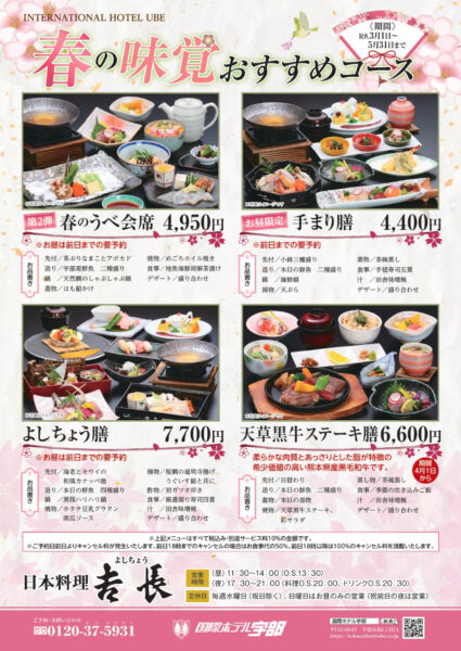 お食事トップ フェア・特集 創作ダイニング「カメリア」 日本料理「吉長」 鉄板焼「旬」 お客様各位 レストラン定休日のお知らせ 平素より国際ホテル宇部をご利用頂き誠にありがとうございます。 令和5年10月より各レストランにおきまして、下記の通り定休日を設定させて頂く事となりました。 日本料理 𠮷長: 水曜日(祝日を除く、日曜日はお昼のみの営業と祝前日は営業します。) 創作ダイニング カメリア: 月曜日(祝日を除く)(朝食は営業致します。) 鉄板焼 旬:定休日なし(前日までのご予約) 日本料理 𠮷長: 水曜日(祝日を除く) 創作ダイニング カメリア: 月曜日(祝日を除く) (朝食は営業致します。) 鉄板焼 旬: 定休日なし(前日までのご予約) お客様にはご不便をおかけ致しますが、更なるサービス向上に努めて参りますので、何卒ご理解賜りますようよろしくお願い申し上げます。 国際ホテル宇部 PREV2026年 3月NEXT日月火水木金土123456789101112131415161718192021222324252627282930311234 定休日(カメリア)定休日(𠮷長)日曜日の午後の営業はお休みさせて頂きます。祝前日は営業致します。(吉長)日曜日ですが祝前日の為、終日営業致します(𠮷長)火曜日割引適用外日(旬・𠮷長・カメリア) お知らせ 2026.02.26朝食臨時休業のおしらせ 2023.05.23一部商品価格改定のお知らせ (各レストラン) 2023.01.01各レストラン最新情報 【アカウント停止・結合のお知らせ】 この度、国際ホテル宇部フロントの@international_ こんにちは😃 久々の投稿です😅 少しずつですが、過ごしやすい季節になりましたね🍁 毎年恒例のハロウィ 【バラ🌹の季節到来】 市内でバラの花が見頃を迎えていますね ホテルから一番近いところでは、渡辺翁 🇯🇵こどもの日🇯🇵 今日はこどもの日 本館1階の螺旋階段の側にある兜飾りの前では、写真撮影される家 お客様へご案内 鉄板焼『旬』 お昼営業承ります(要予約) 夜とはまた違う景色を楽しみながら、美味しいお料理で素敵な一時を過ごしませんか? ・3名様以上より ・7日前までの要予約 ・火曜日20%OFF適用外 フェア・特集 春のよしちょう膳春の味覚おすすめコースまちじゅうエヴァグルメフェア エヴァンゲリオン×カメリア 第5弾始動!9月より!【フグ三昧】グランドメニュー開業10周年記念特別コース「特別コース 極(きわみ)」「宇部市シニアおでかけサポーター」参加店 創作ダイニング「カメリア」 ホテルの中にあるカジュアルなレストラン「創作ダイニング カメリア」は、ご朝食、ランチタイム、ディナータイムともにリーズナブルな料金で、お客様のお越しをお待ちしております。 営業時間 【ランチタイム】 11:30~14:30(LO14:00) 【ディナータイム】18:00~21:00(最終入店 20:00) 【定休日】月曜日(祝日を除く)(朝食は営業致します。) 詳しくは定休日カレンダーをご覧下さい。 創作ダイニング「カメリア」 日本料理 「𠮷長」 四季折々、こだわりの旬の食材で勝負!! 山口県内外のこだわりの旬の食材を吟味し、料理人の技と感性を用い最高の一品に仕上げております。伝統を守りつつ今の時代にも合う料理の提供を心がけ当店ならではの最高のおもてなしを行っております。お祝い、結納、法要、ちょっとしたお集まりの席に幅広くご利用いただけます。 営業時間 【昼】11:30~14:00(料理LO13:30) 【夜】17:30~21:00(料理LO20:00、ドリンクLO20:30) 【定休日】水曜日(祝日を除く、日曜日はお昼のみの営業と祝前日は営業します。) 詳しくは定休日カレンダーをご覧下さい。 席数 74席 蔵の間8室 東山(4)伏見(4)鳥羽(4)嵯峨(4) 宇治(8)桃山(8)熊野(8)貴船(8) (宇治、桃山16)(熊野、貴船16) 離宮 テーブル26席 日本料理 「𠮷長」 鉄板焼「旬」 宇部の夜景を一望できる鉄板焼「旬」は、厳選した黒毛和牛に多彩な旬の食材の旨味を鉄板の上で焼き上げます。 10名様までご利用頂けるカウンター席に加え、6名様収容の個室も人気の店内では、料理人との楽しい語らいやパフォーマンスが楽しめます。 お客様の特別な一日を心より、おもてなし致します。 営業時間 18:00~22:00(オーダーストップ20:30)※ドリンクは21:30 ※昼のご予約はお問い合わせ下さい。 鉄板焼「旬」 各レストランキャンセルポリシーについて ご予約日前日よりキャンセル料が発生いたします。 前日18時までのキャンセルの場合はお食事代の50%、前日18時以降は100%のキャンセル料を頂戴いたします。 (一部2日前又は3日前以降キャンセル料が発生する商品がございます。) LINE公式アカウント 友だち募集中 LINEでお店のクーポンがもらえる!