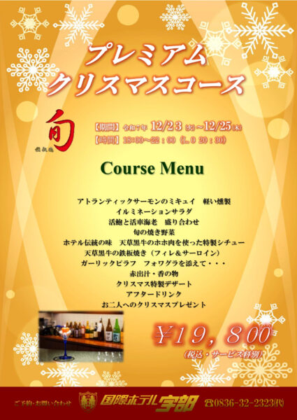 お食事トップ フェア・特集 創作ダイニング「カメリア」 日本料理「吉長」 鉄板焼「旬」 レストラン定休日のお知らせ 平素より国際ホテル宇部をご利用頂き誠にありがとうございます。 令和5年10月より各レストランにおきまして、下記の通り定休日を設定させて頂く事となりました。 日本料理 𠮷長: 水曜日(祝日を除く、日曜日はお昼のみの営業と祝前日は営業します。) 創作ダイニング カメリア: 月曜日(祝日を除く)(朝食は営業致します。) 鉄板焼 旬:定休日なし(前日までのご予約) 日本料理 𠮷長: 水曜日(祝日を除く) 創作ダイニング カメリア: 月曜日(祝日を除く) (朝食は営業致します。) 鉄板焼 旬: 定休日なし(前日までのご予約) お客様にはご不便をおかけ致しますが、更なるサービス向上に努めて参りますので、何卒ご理解賜りますようよろしくお願い申し上げます。 国際ホテル宇部 PREV2025年 12月NEXT日月火水木金土3012345678910111213141516171819202122232425262728293031123 定休日(カメリア)定休日(𠮷長)日曜日の午後の営業はお休みさせて頂きます。祝前日は営業致します。(吉長)日曜日ですが祝前日の為、終日営業致します(𠮷長)火曜日割引適用外日(旬・𠮷長・カメリア) お知らせ 2023.05.23一部商品価格改定のお知らせ (各レストラン) 2023.01.01各レストラン最新情報 お客様へご案内 鉄板焼『旬』 お昼営業承ります(要予約) 夜とはまた違う景色を楽しみながら、美味しいお料理で素敵な一時を過ごしませんか? ・3名様以上より ・7日前までの要予約 ・火曜日20%OFF適用外 フェア・特集 宇部レンチョウと海産コース冬の味覚おすすめコース12月1日~令和8年2月28日冬のよしちょう膳プレミアムクリスマスコースうべ会席2025クリスマスプレミアムオードブル2025クリスマス特別ビュッフェ令和8年正月メニュー《1月1日(木)~1月4日(日)》 創作ダイニング「カメリア」 ホテルの中にあるカジュアルなレストラン「創作ダイニング カメリア」は、ご朝食、ランチタイム、ディナータイムともにリーズナブルな料金で、お客様のお越しをお待ちしております。 営業時間 【ランチタイム】 11:30~14:30(LO14:00) 【ディナータイム】18:00~21:00(最終入店 20:00) 【定休日】月曜日(祝日を除く)(朝食は営業致します。) 詳しくは定休日カレンダーをご覧下さい。 創作ダイニング「カメリア」 日本料理 「𠮷長」 四季折々、こだわりの旬の食材で勝負!! 山口県内外のこだわりの旬の食材を吟味し、料理人の技と感性を用い最高の一品に仕上げております。伝統を守りつつ今の時代にも合う料理の提供を心がけ当店ならではの最高のおもてなしを行っております。お祝い、結納、法要、ちょっとしたお集まりの席に幅広くご利用いただけます。 営業時間 【昼】11:30~14:00(料理LO13:30) 【夜】17:30~21:00(料理LO20:00、ドリンクLO20:30) 【定休日】水曜日(祝日を除く、日曜日はお昼のみの営業と祝前日は営業します。) 詳しくは定休日カレンダーをご覧下さい。 席数 74席 蔵の間8室 東山(4)伏見(4)鳥羽(4)嵯峨(4) 宇治(8)桃山(8)熊野(8)貴船(8) (宇治、桃山16)(熊野、貴船16) 離宮 テーブル26席 日本料理 「𠮷長」 鉄板焼「旬」 宇部の夜景を一望できる鉄板焼「旬」は、厳選した黒毛和牛に多彩な旬の食材の旨味を鉄板の上で焼き上げます。 10名様までご利用頂けるカウンター席に加え、6名様収容の個室も人気の店内では、料理人との楽しい語らいやパフォーマンスが楽しめます。 お客様の特別な一日を心より、おもてなし致します。 営業時間 18:00~22:00(オーダーストップ20:30)※ドリンクは21:30 ※昼のご予約はお問い合わせ下さい。 鉄板焼「旬」 各レストランキャンセルポリシーについて ご予約日前日よりキャンセル料が発生いたします。 前日18時までのキャンセルの場合はお食事代の50%、前日18時以降は100%のキャンセル料を頂戴いたします。 (一部2日前又は3日前以降キャンセル料が発生する商品がございます。) LINE公式アカウント 友だち募集中 LINEでお店のクーポンがもらえる!