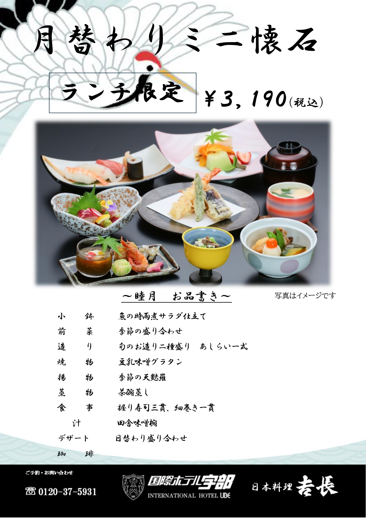 グランドメニューはこちら 公式LINE アカウント お友だち募集中! 四季折々、こだわりの旬の食材で勝負!! 山口県内外のこだわりの旬の食材を吟味し、料理人の技と感性を用い最高の一品に仕上げております。伝統を守りつつ今の時代にも合う料理の提供を心がけ当店ならではの最高のおもてなしを行っております。お祝い、結納、法要、ちょっとしたお集まりの席に幅広くご利用いただけます。 営業時間 【昼】11:30~14:00(料理LO13:30) 【夜】17:30~21:00(料理LO20:00、ドリンクLO20:30) 【定休日】水曜日(祝日を除く、日曜日はお昼のみの営業と祝前日は営業します。) 詳しくは定休日カレンダーをご覧下さい。 【席数】74席 蔵の間8室 東山(4)伏見(4)鳥羽(4)嵯峨(4) 宇治(8)桃山(8)熊野(8)貴船(8) (宇治、桃山16)(熊野、貴船16) 離宮 テーブル26席 昼 夜 単品 お祝い(要予約) 法要(要予約) 季節 テイクアウト お知らせ 2025.04.10グランドメニュー 2025.03.214月1日から!「天麩羅ランチ」と「華御膳」が登場◎ 2024.05.20毎週日曜日の夜営業がお休みとなります お知らせ一覧 kokusai_yoshicho 12月より【よしちょう膳】の内容が変わります⛄️✨️ 寒い日には嬉しい鰆のしゃぶしゃぶ鍋🍲 📢【お知らせ】 10月よりご提供しておりました≪松茸づくしコース≫は、ご好評につき予定よりも早く販 季節の移ろいを感じながら、地元の味覚を堪能していただける「うべ会席」🌿 10月1日より、秋限定でご用 【秋のよしちょう膳🍂9月1日〜11月30日まで】 旬の味覚を贅沢に盛り込んだ「よしちょう膳」✨️ フェア・特集 宇部レンチョウと海産コース冬の味覚おすすめコース12月1日~令和8年2月28日冬のよしちょう膳令和8年正月メニュー《1月1日(木)~1月4日(日)》9月より!【フグ三昧】グランドメニュー 昼のメニュー 本マグロフェア 単品メニュー 12月1日より マグロ刺身盛り合わせ (大トロ・中トロ・赤身)3,300円 マグロ寿司盛り合わせ (大トロ・中トロ・赤身・マグロとアボカドの中巻き) 2,200円 マグロ丼 1650円 マグロサラダ 1,320円 マグロ竜田揚げ 1,320円 マグロ和風カルパッチョ 1,320円 マグロ山掛け 880円 よしちょう忘新年会コース 期間 令和8年1月15日まで (令和8年1月1日~1月4日は販売を中止させていただきます。) 料金 8,500円(税サ・ドリンク込) 品目 先付 日替わり和え物 造り 鮮魚四種盛り合わせ 蓋物 本日の温物 鍋 寄せ鍋 揚物 天ぷら盛り合わせ 蒸物 茶碗蒸し 食事 特選握り寿司 四貫 汁 田舎味噌椀 デザート 二種盛り合わせ 10,500円 ←(通常11,253円) よしちょう膳+2時間飲み放題 12,500円←(通常13,653円) 会席 雅+2時間飲み放題 2日前までの要予約 宇部レンチョウと海産コース 期間 令和7年12月1日~令和8年2月28日まで ※令和7年12月26日~令和8年1月5日までの間は販売をお休みさせていただきます。 金額 6,050円 (税込み別途サービス料10%) ※仕入れ状況により販売できない場合がございます。あらかじめのご予約をお勧め致します。 献立 先付 レンチョウ飴煮、地魚胡麻醤油漬け、けんぶつじゃこ南蛮漬け 肴 レンチョウ姿造りと雲丹しゃぶ鍋 焼物 レンチョウ和風ムニエル 揚物 レンチョウから揚げ 食事 レンチョウ漬け小丼 香の物 盛り合わせ デザート 三種盛り 単品 レンチョウ姿造りと唐揚げ 2,750円 レンチョウ姿造りと唐揚げ、雲丹しゃぶ鍋 3,300円 レンチョウ和風ムニエル(1尾) 1,650円 レンチョウ漬け丼 1,650円 (税込・別途サービス料10%) 天麩羅ランチ 料金 お一人様 2,200円(税込) 品目 小鉢三種、サラダ、天麩羅、茶碗蒸し、炊込みご飯、田舎味噌椀、香の物、氷菓子、珈琲 和ごころ膳 料金 お一人様 2,530円(税込) 品目 小鉢、造り二種盛り、天麩羅盛り合わせ、茶わん蒸し、炊き込み御飯、田舎味噌椀、香の物、水菓子、珈琲 ミニ懐石 料金 お一人様 3,190円(税込) 品目 魚の時雨煮サラダ仕立て、月替わり前菜盛り合わせ、旬のお造り二種盛り、豆乳味噌グラタン、季節の天麩羅、茶碗蒸し、 握り寿司三貫、細巻一貫、田舎味噌椀、日替わりデザート盛り合わせ 四季彩膳 料金 お一人様 4,510円(税込) 品目 小鉢、造り二種盛り、あら炊き、牛ロース鉄板焼き、天麩羅盛り合わせ、茶わん蒸し、炊き込み御飯、田舎味噌椀、香の物、珈琲 お子様コース 料金 1,650円(税込・サービス料別) 品目 鶏唐揚げ、うどん、おにぎり、玉子焼き、茶碗蒸し、ソフトドリンク、アイスクリーム ■地魚海鮮天丼 料金 お一様1,100円(税込) ■まかない風海鮮丼 料金 お一様1,210円(税込) ※離宮の間限定(個室での提供は行っておりません) ※各種割引適応外 夜のメニュー 本マグロフェア 単品メニュー 12月1日より マグロ刺身盛り合わせ (大トロ・中トロ・赤身)3,300円 マグロ寿司盛り合わせ (大トロ・中トロ・赤身・マグロとアボカドの中巻き) 2,200円 マグロ丼 1650円 マグロサラダ 1,320円 マグロ竜田揚げ 1,320円 マグロ和風カルパッチョ 1,320円 マグロ山掛け 880円 よしちょう忘新年会コース 期間 令和8年1月15日まで (令和8年1月1日~1月4日は販売を中止させていただきます。) 料金 8,500円(税サ・ドリンク込) 品目 先付 日替わり和え物