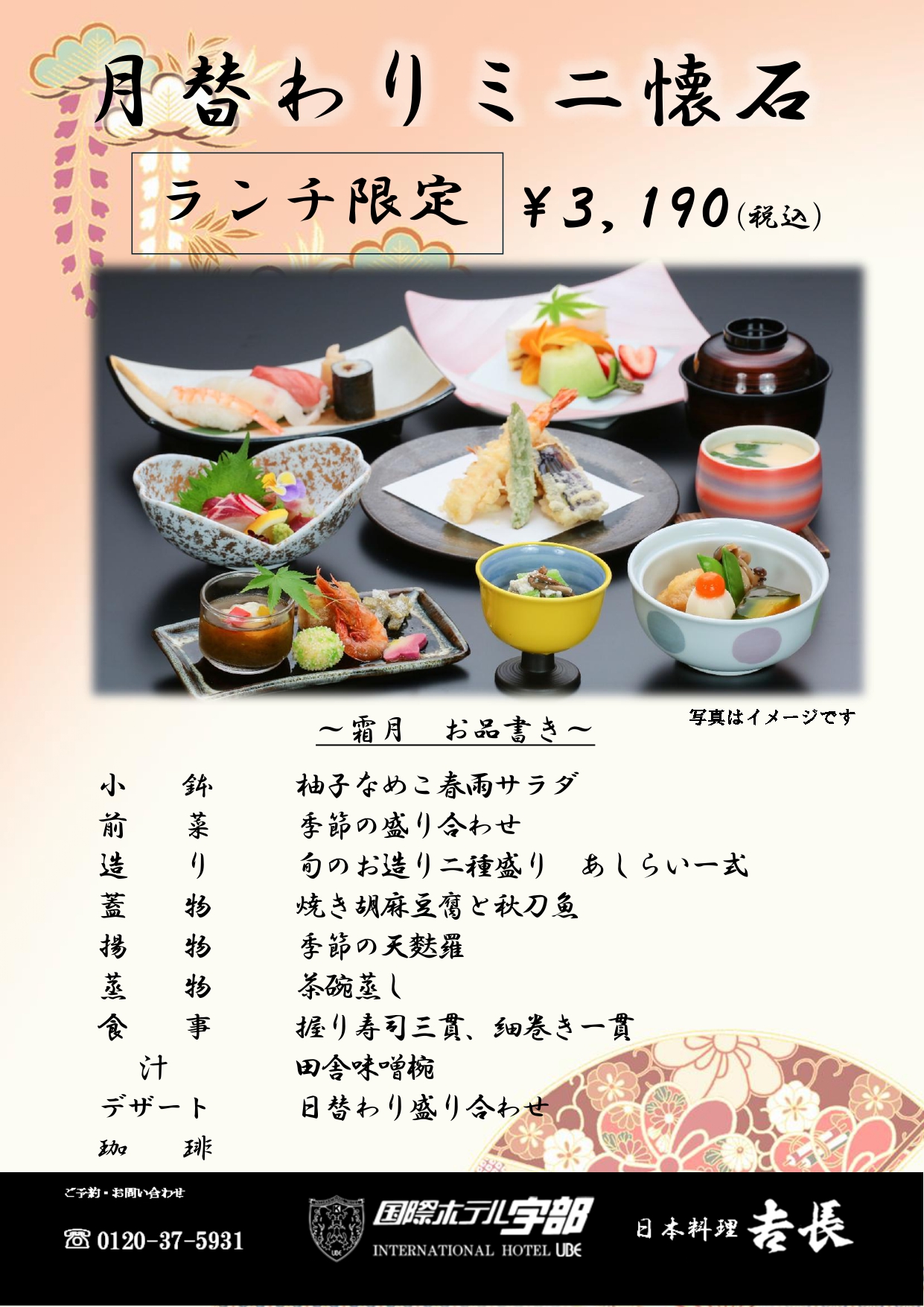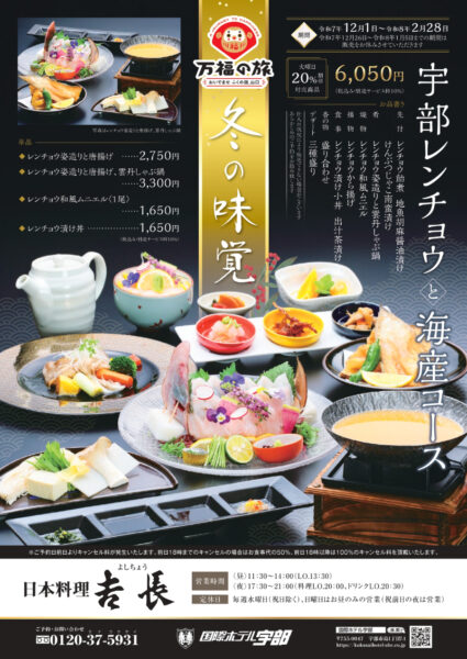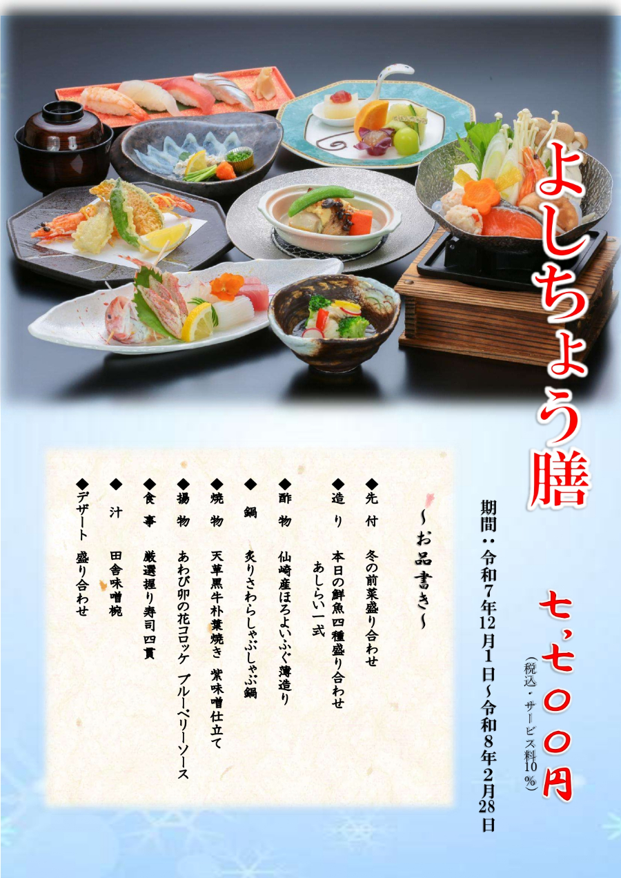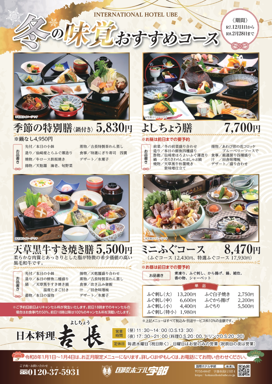 グランドメニューはこちら 公式LINE アカウント お友だち募集中! 四季折々、こだわりの旬の食材で勝負!! 山口県内外のこだわりの旬の食材を吟味し、料理人の技と感性を用い最高の一品に仕上げております。伝統を守りつつ今の時代にも合う料理の提供を心がけ当店ならではの最高のおもてなしを行っております。お祝い、結納、法要、ちょっとしたお集まりの席に幅広くご利用いただけます。 営業時間 【昼】11:30~14:00(料理LO13:30) 【夜】17:30~21:00(料理LO20:00、ドリンクLO20:30) 【定休日】水曜日(祝日を除く、日曜日はお昼のみの営業と祝前日は営業します。) 詳しくは定休日カレンダーをご覧下さい。 【席数】74席 蔵の間8室 東山(4)伏見(4)鳥羽(4)嵯峨(4) 宇治(8)桃山(8)熊野(8)貴船(8) (宇治、桃山16)(熊野、貴船16) 離宮 テーブル26席 昼 夜 単品 お祝い(要予約) 法要(要予約) 季節 テイクアウト お知らせ 2025.04.10グランドメニュー 2025.03.214月1日から!「天麩羅ランチ」と「華御膳」が登場◎ 2024.05.20毎週日曜日の夜営業がお休みとなります お知らせ一覧 kokusai_yoshicho 📢【お知らせ】 10月よりご提供して 【9月より開始🍂コース告知📣】 告 フェア・特集 宇部レンチョウと海産コース冬の味覚おすすめコース12月1日~令和8年2月28日冬のよしちょう膳うべ会席おせち完売致しました令和8年正月メニュー《1月1日(木)~1月4日(日)》秋の味覚おすすめコース9月1日~11月30日秋のよしちょう膳9月より!【フグ三昧】グランドメニュー 昼のメニュー 天麩羅ランチ 料金 お一人様 2,200円(税込) 品目 小鉢三種、サラダ、天麩羅、茶碗蒸し、炊込みご飯、田舎味噌椀、香の物、氷菓子、珈琲 和ごころ膳 料金 お一人様 2,530円(税込) 品目 小鉢、造り二種盛り、天麩羅盛り合わせ、茶わん蒸し、炊き込み御飯、田舎味噌椀、香の物、水菓子、珈琲 ミニ懐石 料金 お一人様 3,190円(税込) 品目 柚子なめこ春雨サラダ 月替わり前菜盛り合わせ 旬のお造り二種盛り 焼き胡麻豆腐と秋刀魚 季節の天麩羅 茶碗蒸し 握り寿司三貫、巻き一貫 田舎味噌椀 日替わり盛り合わせ 四季彩膳 料金 お一人様 4,510円(税込) 品目 小鉢、造り二種盛り、あら炊き、牛ロース鉄板焼き、天麩羅盛り合わせ、茶わん蒸し、炊き込み御飯、田舎味噌椀、香の物、珈琲 お子様コース 料金 1,650円(税込・サービス料別) 品目 鶏唐揚げ、うどん、おにぎり、玉子焼き、茶碗蒸し、ソフトドリンク、アイスクリーム ■地魚海鮮天丼 料金 お一様1,100円(税込) ■まかない風海鮮丼 料金 お一様1,210円(税込) ※離宮の間限定(個室での提供は行っておりません) ※各種割引適応外 夜のメニュー 天刺し膳 料金 お一人様 2,970円(税込・サービス料別) 品目 小鉢、造り二種盛り、蓋物、天麩羅盛り合わせ、茶わん蒸し、炊き込み御飯、田舎味噌椀、香の物、水菓子 華御膳 料金 お一人様 4,950円(税込・サービス料別) 品目 小鉢、造り二種、鯛のあら焚き、天麩羅、茶碗蒸し、握り寿司五貫細巻き二貫、田舎味噌椀、デザート盛り合わせ 和会席 旬彩膳 料金 お一人様 6,600円(税込・サービス料別) 品目 小鉢、造り四種盛り、蓋物、牛ロース鉄板焼き、天麩羅盛り合わせ、茶わん蒸し、握り寿司三貫、田舎味噌椀、水菓子 よしちょう膳 期間 令和7年9月1日~11月30日 料金 お一人様 7,700円(税込・サービス料別) 品目 秋の前菜盛り合わせ、本日の鮮魚四種盛り合わせ、仙崎産とらふぐの薄造り、松茸土瓶蒸し、秋鮭西京焼き 馬鈴薯ソース、天草黒牛とオクラの串揚げ 赤味噌だれ、特選握り寿司四貫、田舎味噌椀、盛り合わせ ※仕入れ状況により、内容を変更させて頂く場合がございます。 お昼は前日までの要予約 期間 令和7年12月1日~令和8年2月28日 料金 お一人様 7,700円(税込・サービス料別) 品目 冬の前菜盛り合わせ、本日の鮮魚四種盛り合わせ あしらい一式、仙崎産ほろよいふぐ薄造り、炙りさわらしゃぶしゃぶ鍋、天草黒牛朴葉焼き 紫味噌仕立て、あわび卯の花コロッケ ブルーベリーソース、厳選握り寿司四貫、田舎味噌椀、盛り合わせ ※仕入れ状況により、内容を変更させて頂く場合がございます。 お昼は前日までの要予約 和会席 雅(みやび) (2日前までに御予約お願い致します) 料金 お一人様 9,900円(税込・サービス料別) 品目 お料理、握り寿司、汁、デザート 和会席 彩(いろどり) (2日前までに御予約お願い致します) 料金 お一人様 12,650円(税込・サービス料別) 品目 お料理六種、寿司、田舎味噌椀、デザート盛り合わせ 料理長特撰おすすめ会席 粋(いき) 料金 お一人様 15,400円(税込・サービス料別)(予約制) (※2日前までの要予約) 品目 お料理六種、寿司、田舎味噌椀、デザート盛り合わせ 料理長特撰おすすめ会席 葵(あおい) 料金 お一人様 18,700円(税込・サービス料別)(予約制) (※2日前までの要予約) 品目 お料理六種、寿司、田舎味噌椀、デザート盛り合わせ 料理長特撰おすすめ会席 超絶(ちょうぜつ) 料金 お一人様 24,200円(税込・サービス料別)(予約制) (※2日前までの要予約) 品目 お料理六種、寿司、田舎味噌椀、デザート盛り合わせ 
