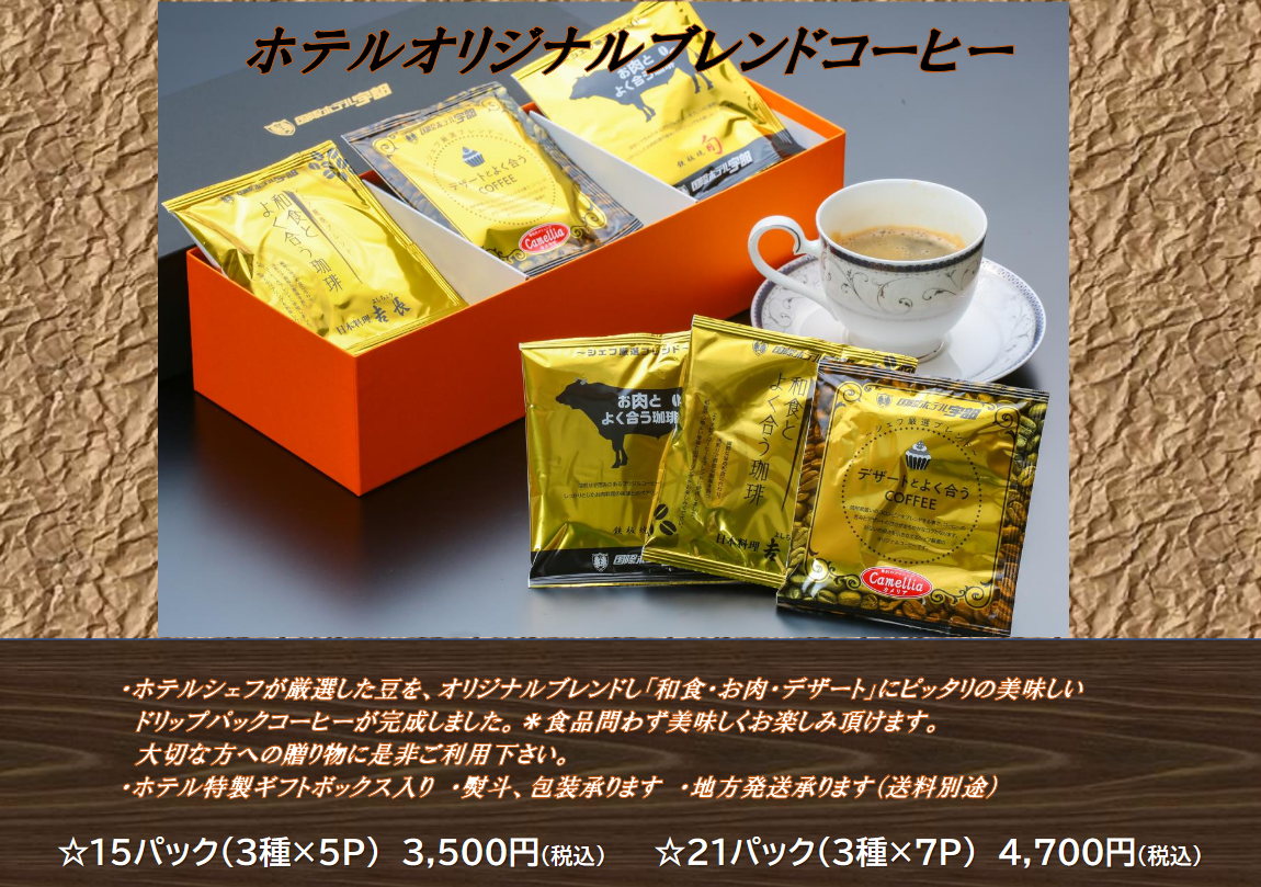 ホテルオリジナルブレンドコーヒー ホテルシェフが厳選した豆を、オリジナルブレンドし「和食・お肉・デザート」にピッタリの美味しいドリップパックコーヒーが完成しました。 15パック(3種×5P) 3,500円(税込) 21パック(3種×7P) 4,700円(税込) 単品 220円(税込) ※ホテル特製ギフトボックス入り ※熨斗、包装承ります ※配送料別途