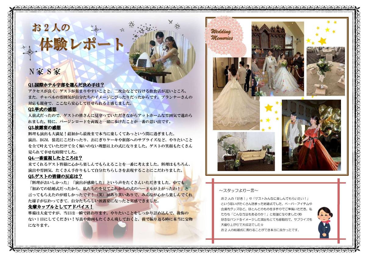 トップ ウェディング相談会 プラン 挙式・披露宴会場 よくあるご質問 体験レポート ドレスショップ 体験レポート ■N家S家 挙式:人前式披露宴会場:3Fダイヤモンドホールご招待人数:約120名 ■藤井家樋口家 挙式:人前式披露宴会場:3Fダイヤモンドホールご招待人数:約60名 ■正木家石川家 挙式:人前式お食事会会場:創作ダイニング カメリアご招待人数:約20名 ■小田家村上家 挙式:神前式披露宴会場:ダイヤモンドホールご招待人数:約70名 ■山本家伊藤家 挙式:神前式披露宴会場:ダイヤモンドホールご招待人数:約50名 ■濱北家守岡家 挙式:チャペル式披露宴会場:創作ダイニング カメリアご招待人数:約65名 ■U家O家 挙式:人前式披露宴会場:ダイヤモンドホールご招待人数:約30名 ■M家M家 挙式:神前式お披露目会会場:パールご招待人数:約20名 ■藤岡家森田家 挙式:人前式お披露目会会場:パールご招待人数:約30名